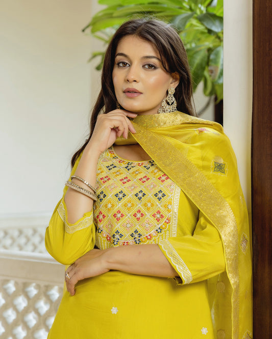 Kesari Lime Yellow Multicolour Geometric Embroidered Kurta Set