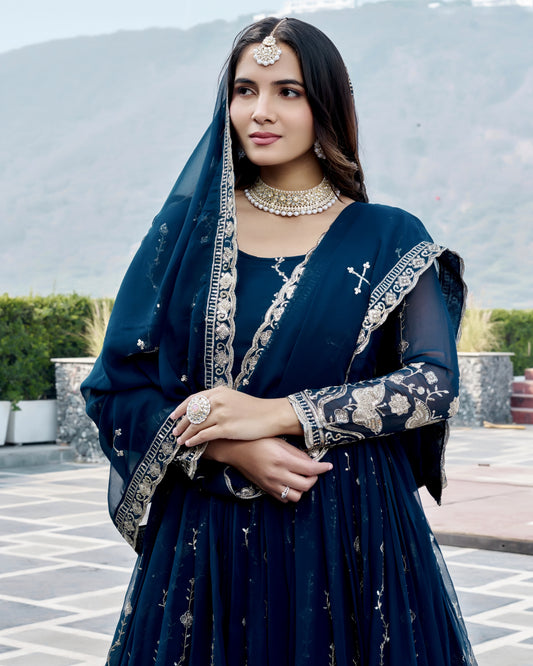 Teal Blue Georgette Anarkali Gown with Dupatta