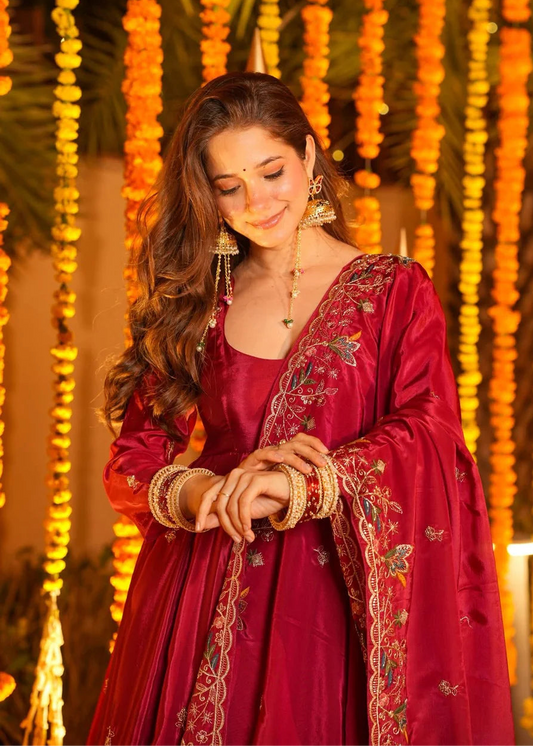 Ujjwala White Gold & Red Floral Embroidered Anarkali Suit Set