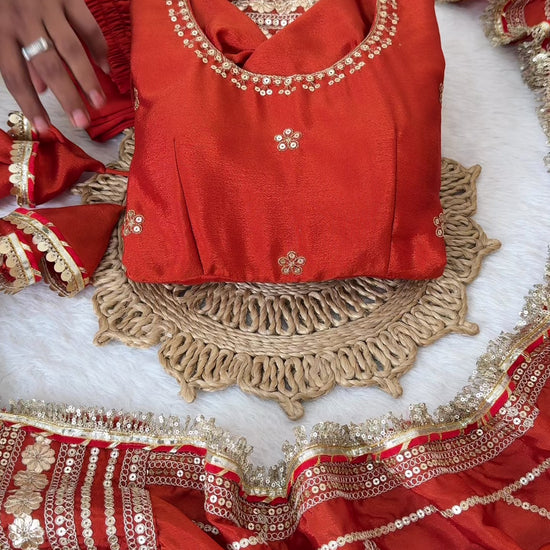 Make a bold and beautiful statement in this striking 3-piece rust orange Anarkali set that perfectly captures the warmth and vibrancy of Indian festive fashion. The floor-length flared Anarkali is crafted in smooth, rich fabric with a graceful pleated silhouette that flows elegantly with every step. The round neckline is delicately embroidered with gold sequin work and finished with a classic tie-back dori, while dainty gold floral booti motifs are scattered across the bodice for a subtle yet charming detail. The hem of the Anarkali is the true highlight — featuring multiple broad bands of dense gold and white sequin floral embroidery with a decorative coin tassel trim that adds a festive, traditional touch. Paired with a matching elasticated bottom and a gorgeous dupatta adorned with diagonal gold sequin floral chains and richly embellished all-around borders.