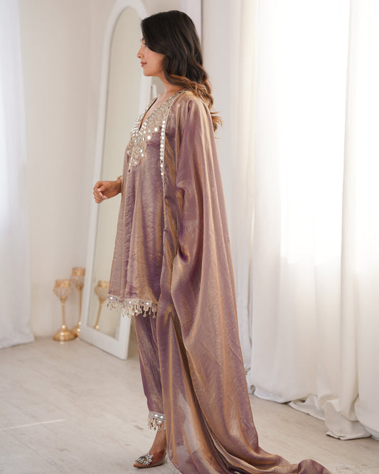 Sonal Mauve-Gold Iridescent Tissue Silk Mirror-Work Suit Set