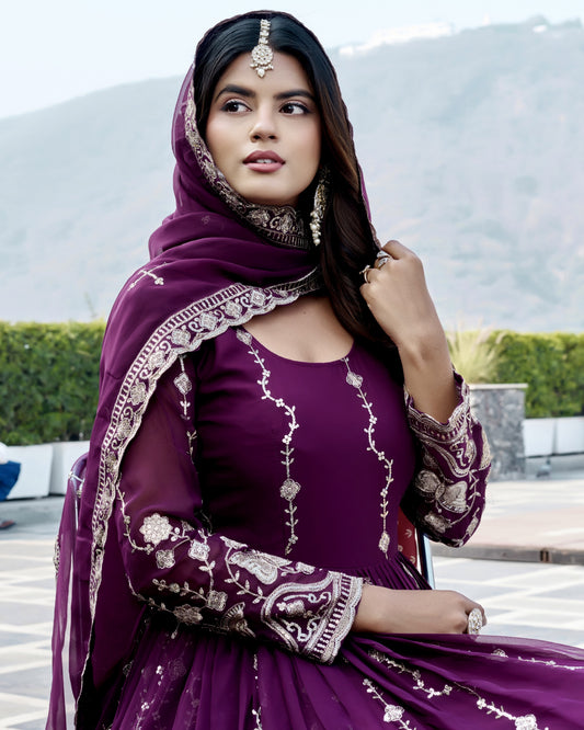 Deep Purple Georgette Anarkali Gown With Dupatta